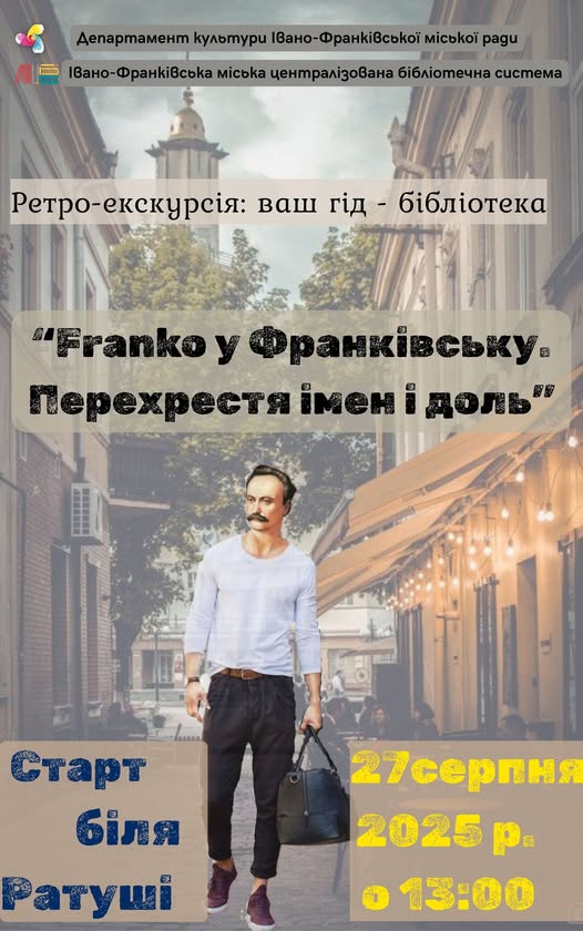 27 серпня о 13.00 год біля ратуші розпочнеться ретро-екскурсія "Франко у Франківську. Перехрестя імен і доль". Захід приурочено 169 річниці від дня народження І. Франка. Запрошуємо всіх охочих довідатися цікаві моменти з життя та творчості Івана Франка.
