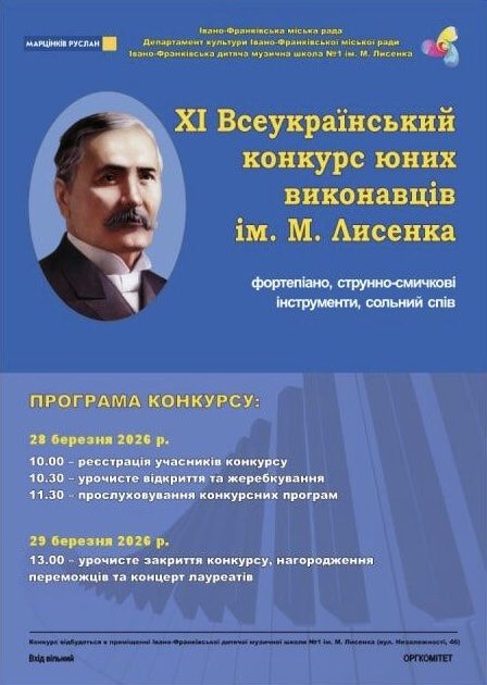 28-29 березня в Івано-Франківській дитячій музичній школі №1 ім. М. Лисенка відбудеться ХІ Всеукраїнський конкурс юних виконавців ім. М. Лисенка. 28 березня о 10.30 год відбудеться відкриття конкурсу, 29 березня о 13.00 год - концерт переможців. Вхід вільний.