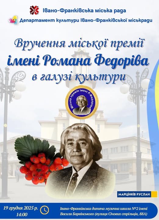 19 грудня о 14.00 год в актовій залі Івано-Франківської дитячої музичної школи №2 ім. В. Барвінського (вул. Січових Стрільців, 88а) відбудеться вручення міської премії ім. Р.Федоріва в галузі культури. Вхід вільний.